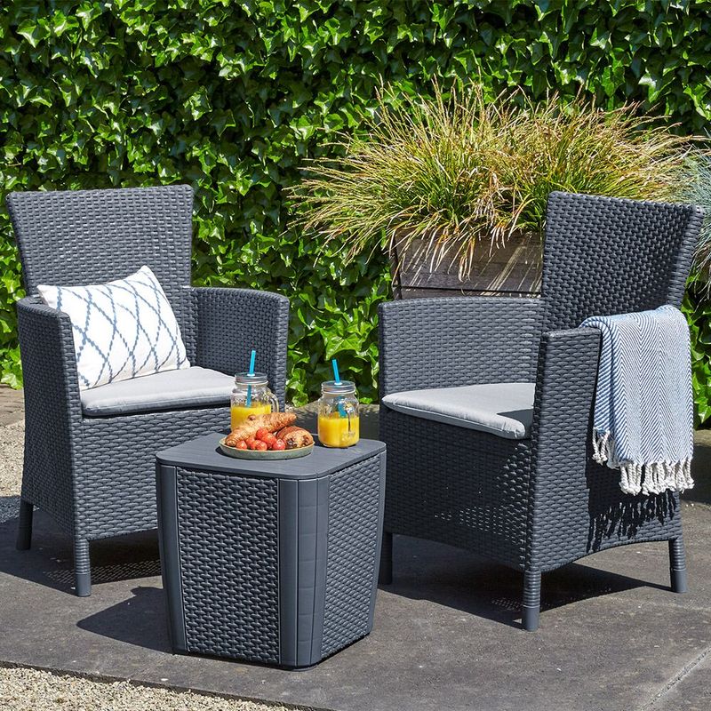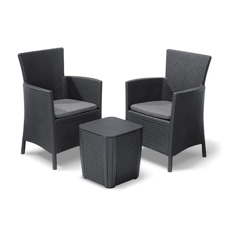 » Descripción: El conjunto de jardín y terraza Iowa de Keter es una moderna y elegante solución para tu jardín o terraza. Con un diseño actual y acabado imitación a ratán, imagínate disfrutando en estos sillones al comienzo de cada día soleado tomando tu desayuno. Estos sillones Iowa son resistentes, pero a la vez ligeros, por lo que puedes moverlos fácilmente. Incluyen cómodos cojines,respaldo y reposabrazos ergonómicos Este conjunto de balcón, jardín y terrazas, también incluye una práctica mesa de almacenamiento que te permite guardar los elementos esenciales de tu jardín