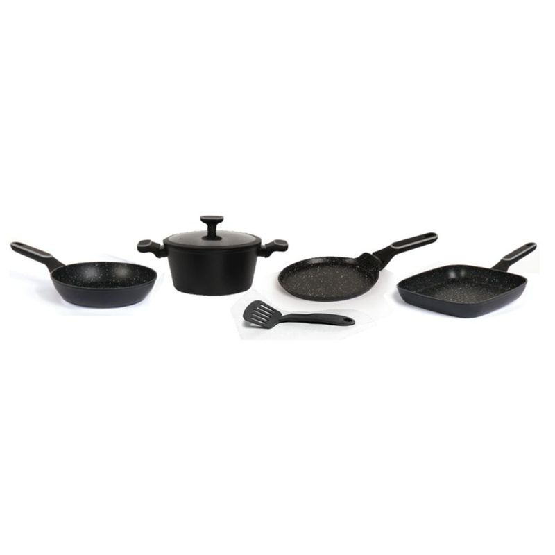 • Selección Completa de Utensilios: Este set incluye una cacerola de 24 cm, un sartén de 24 cm, una bífera acanalada de 27 cm, una panquequera y una espátula de nylon, cubriendo todas las necesidades de una cocina versátil y bien equipada.