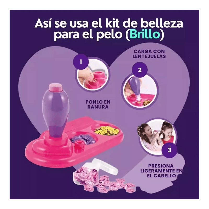 Este encantador set de belleza incluye todo lo que necesitas para crear peinados brillantes y llenos de color. Con su aplicador de brillos, podrás agregar destellos de glamour a tu cabello de manera fácil y divertida.
