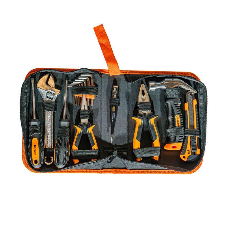 El kit contiene elementos de uso cotidiano como llaves, destornilladores, pinzas, martillo y tester digital, lo que lo convierte en una solución integral para trabajos básicos de electricidad, ajustes, cortes, sujeciones y verificaciones.