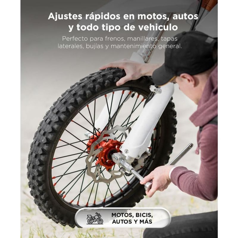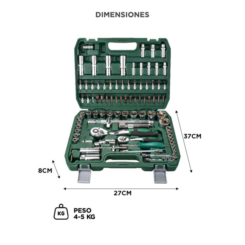 Las 108 piezas se presentan en un maletín plástico resistente con compartimentos a medida que facilitan la organización y el transporte. Ideal para técnicos mecánicos o para tener siempre a mano un set completo en el hogar o vehículo ofreciendo un rendimiento confiable en cada uso.