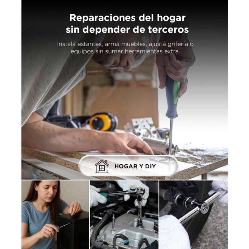 Este juego de herramientas de 108 piezas ofrece una solución completa para reparaciones del hogar mecánica automotriz y trabajos de precisión. Incluye dados de diferentes medidas puntas de múltiples tipos y herramientas esenciales para un ajuste seguro y efectivo.