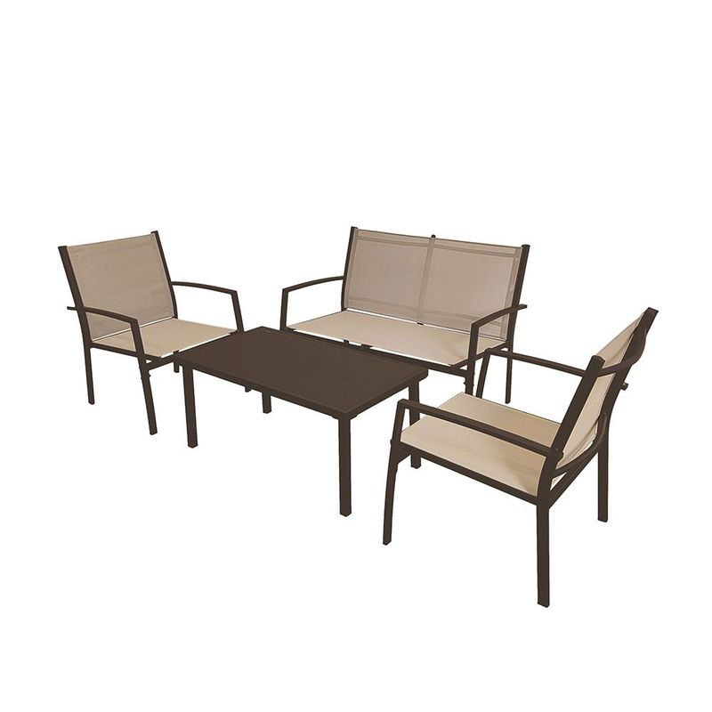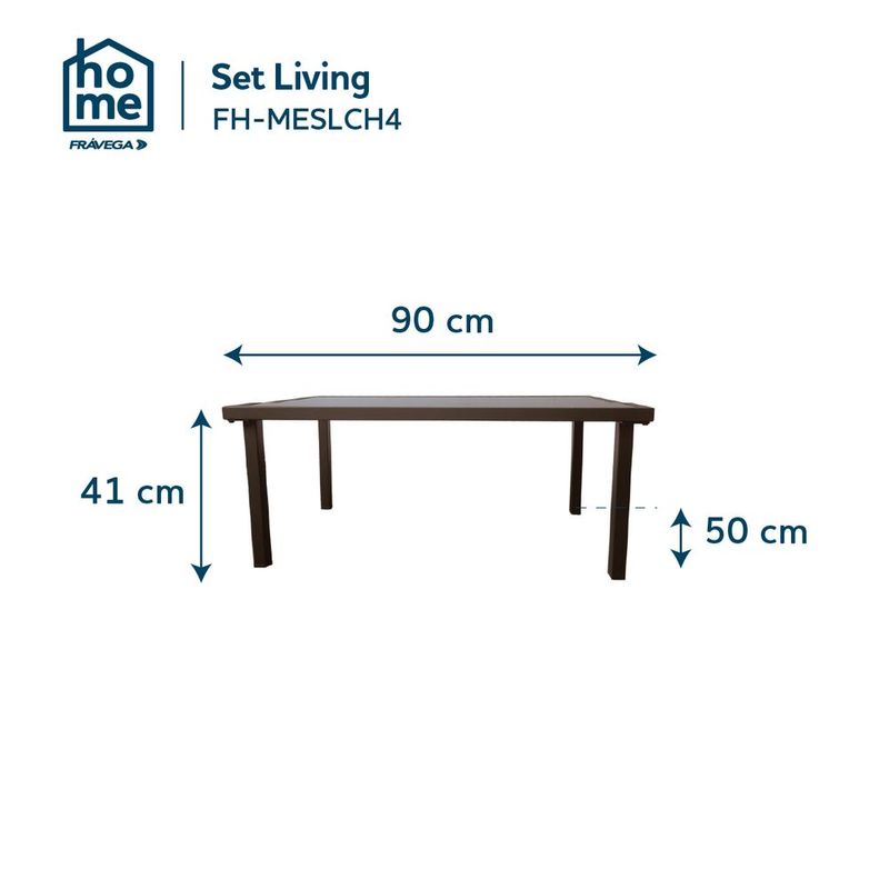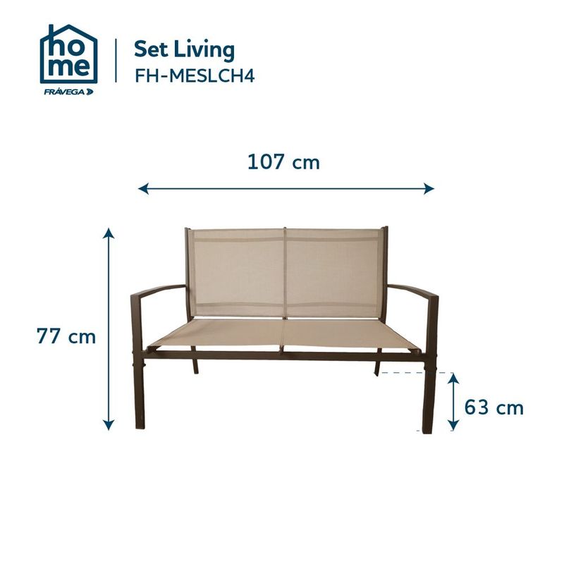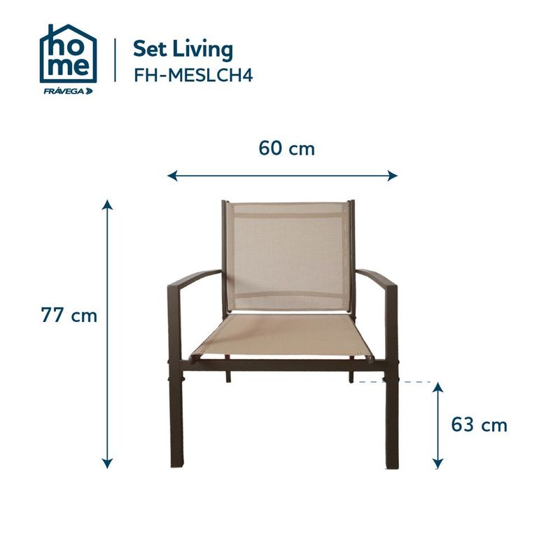 » Caracteristicas: Estructura de acero con terminación en pintura en polvoAsientos y respaldos en textilene 2x1, resistente y de secado rápidoTapa de vidrio templado en la mesa para un toque moderno y fácil limpiezaIncluye2 sillones individuales: 60 x 63 x 77 cm1 sillón doble: 107 x 63 x 77 cm1 mesa de centro: 90 x 50 x 41 cm