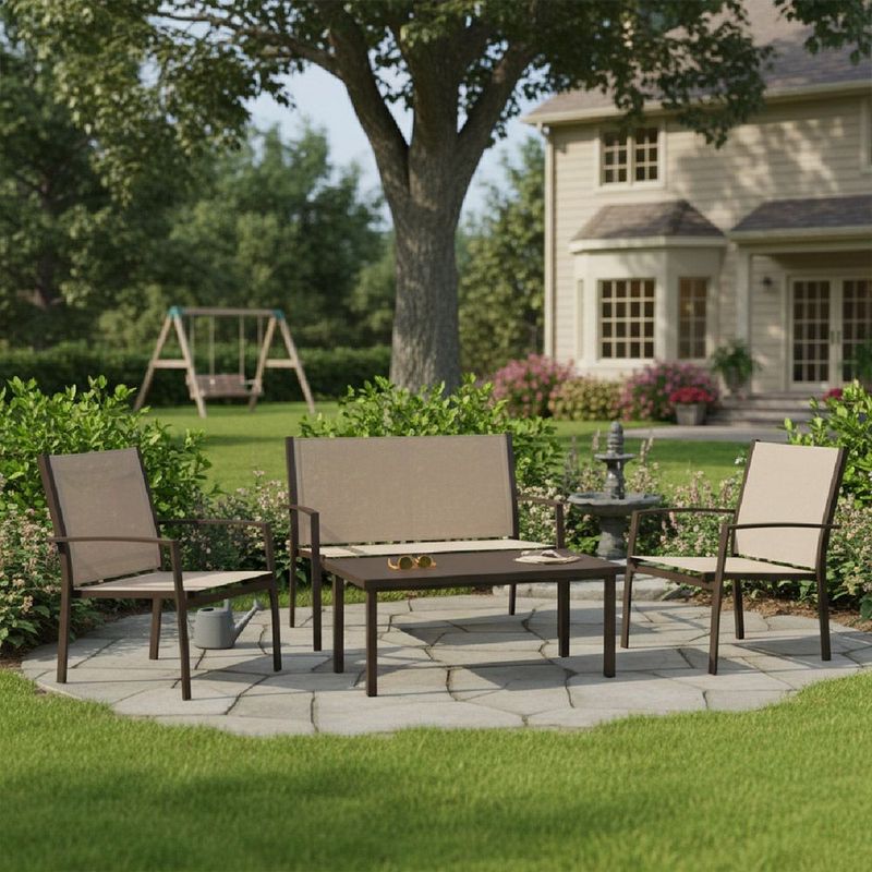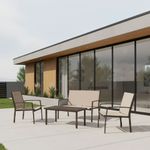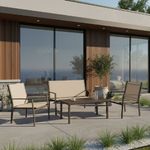 » Descripción: Renová tu espacio exterior con este set de living de 4 piezas, ideal para jardines, balcones o terrazas. Su estructura de acero con pintura en polvo, el tapizado en textilene 2x1 y la mesa con tapa de vidrio lo convierten en una opción duradera, moderna y funcional. Un conjunto cómodo, resistente y con diseño contemporáneo para disfrutar del aire libre con estilo y practicidad.