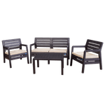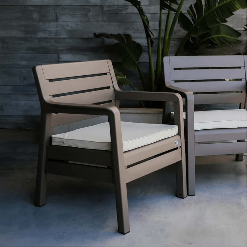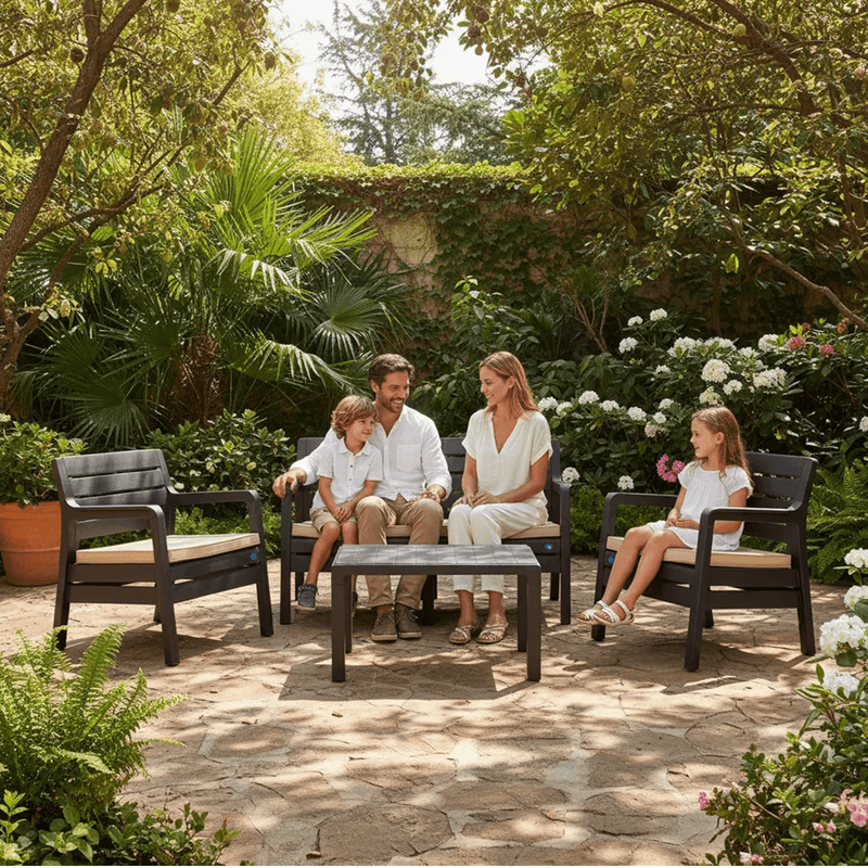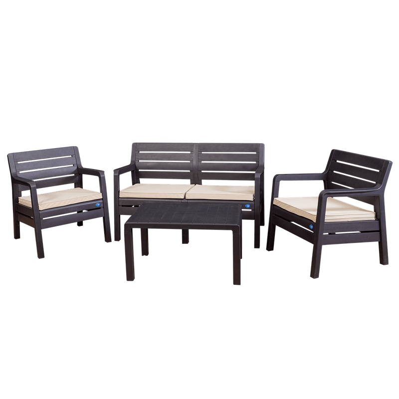 Viene con almohadones de tela impermeable y tanto los sillones como la mesa cuentan con tacos antideslizantes.