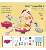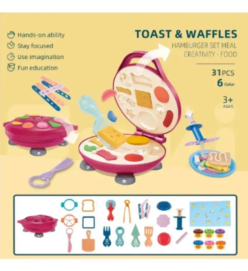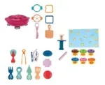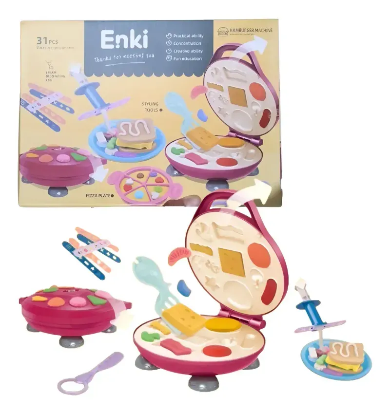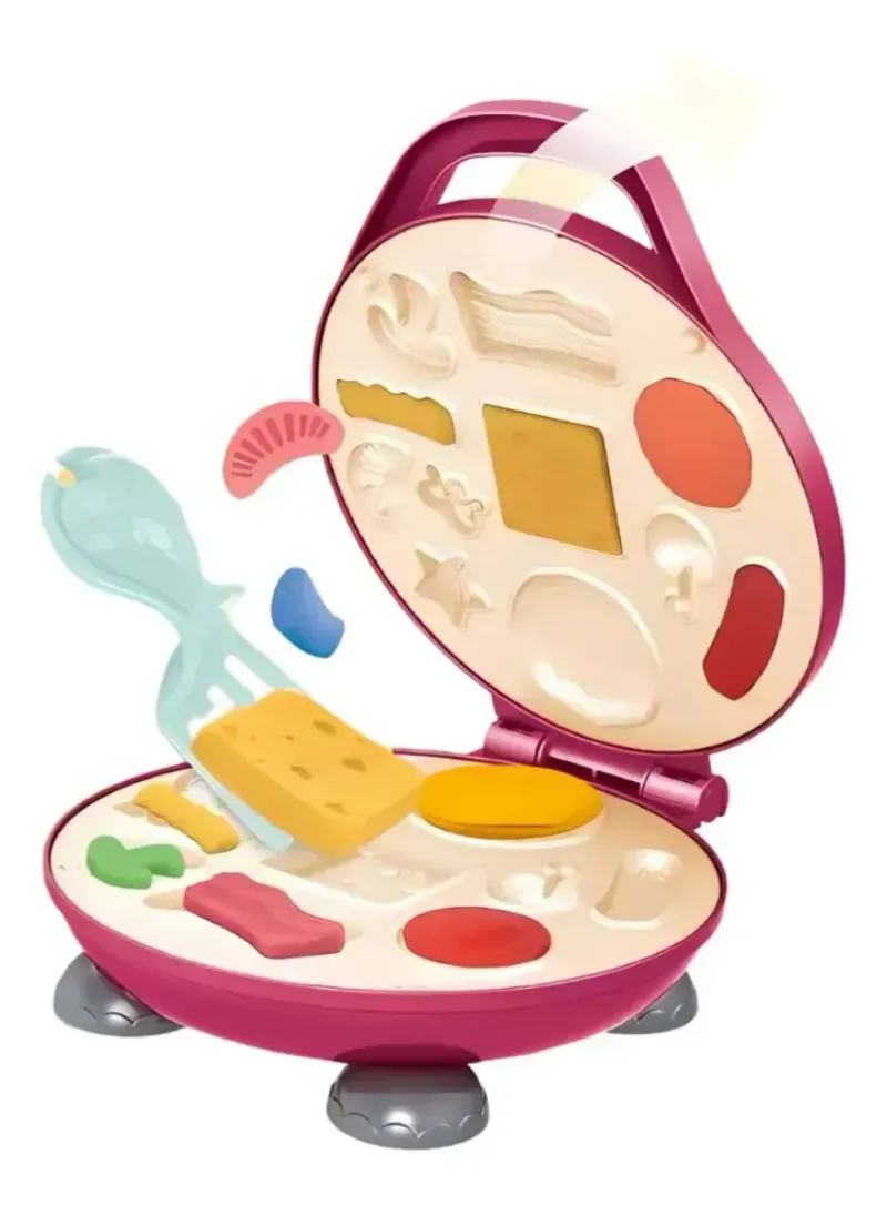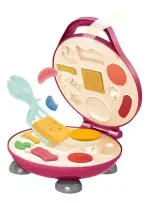 Incluye maquina con moldes, utensillos de cocina: espatula, tenedor, cucharas, cuchillos, pinza, 6 botes de plastilinas de colores, tabla, rodillo para cortar, jeringa y moldes con distintas formas.