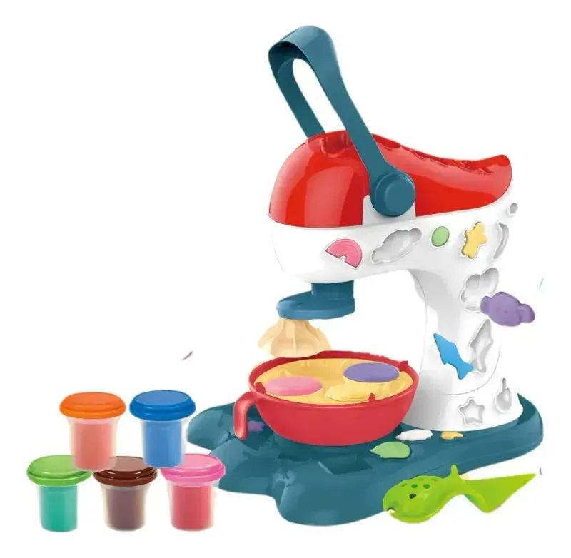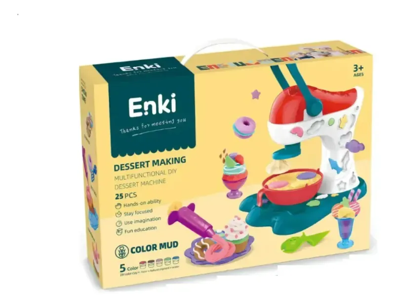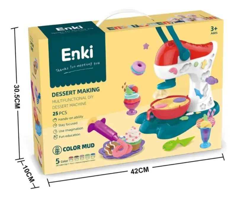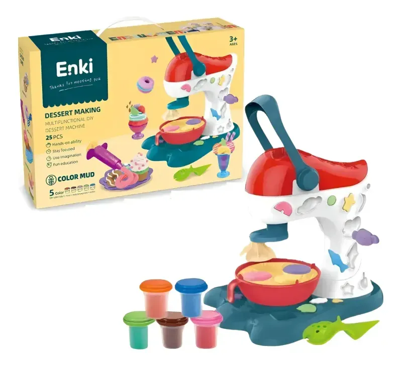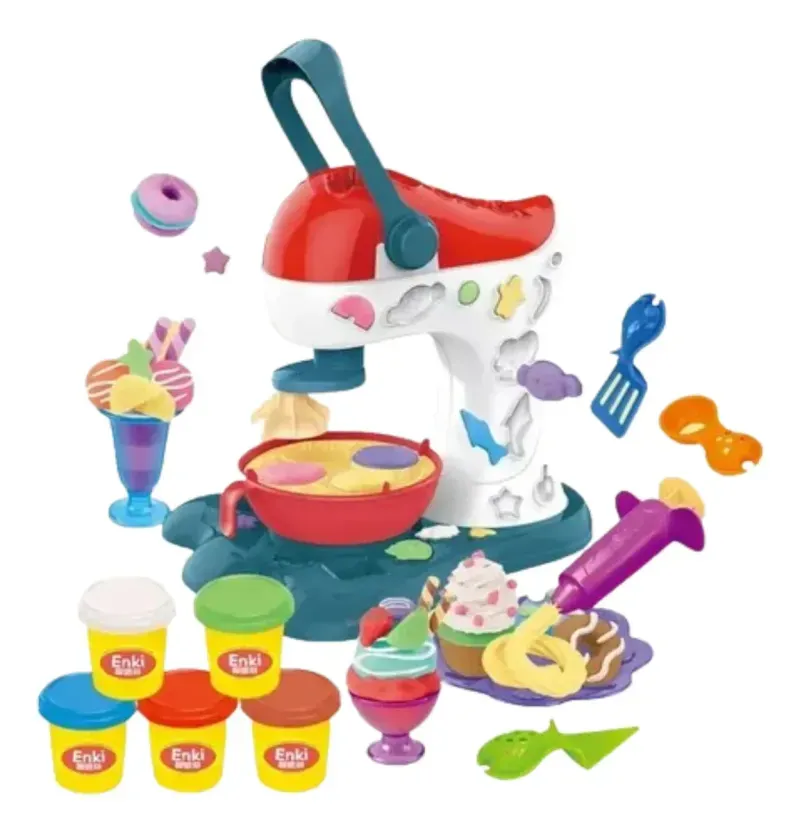 1 Maquina funcional de postres con moldes integrados,6 botes de masas de colores, jeringa para decorar con boquilla, sartén plástica, moldes para helado, 2 espatulas, 2 cucharas, 1 cuchillo, 1 pinza. Adicionales: vasitos para helado, moldes.