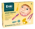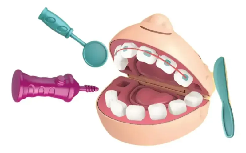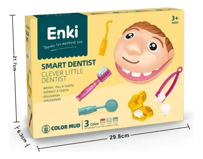 Incluye una cabeza con mandíbula móvil, herramientas dentales: espejo, taladro, pinzas, molde para brackets, torno, 3 botes de plastilina de colores.