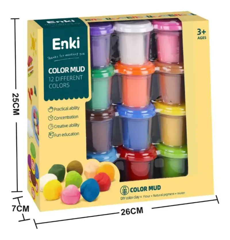 12 diferentes colores, hechos con ingredientes naturales, de textura suave y fácil de moldear.
