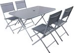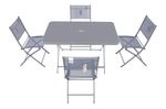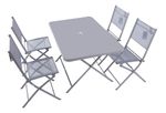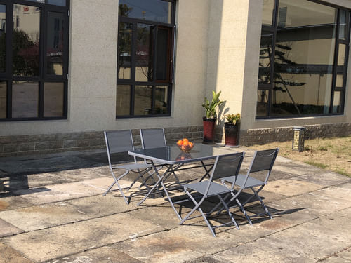 El clásico de reuniones familiares: mesa amplia con 4 sillas resistentes, perfecta para compartir almuerzos, cenas y momentos inolvidables en tu jardín.
