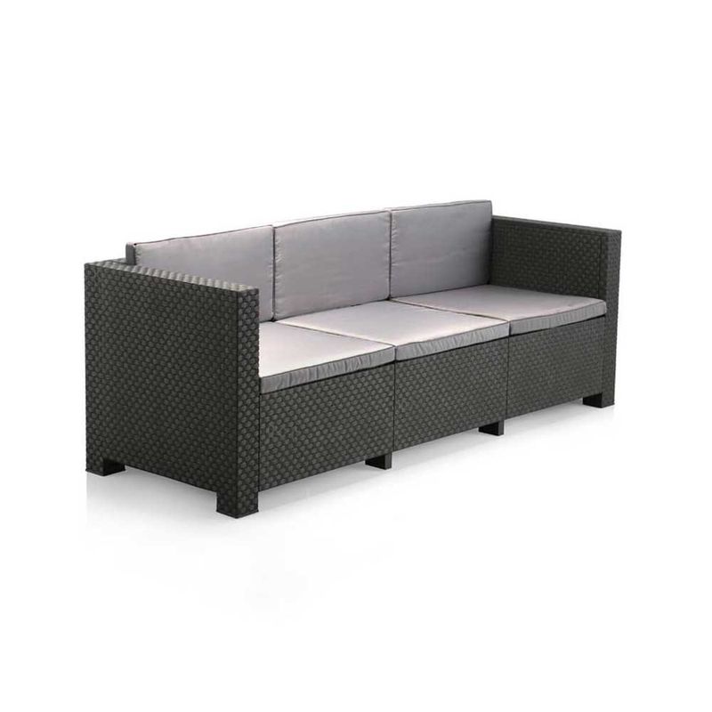 En un elegante color grafito con una textura que imita el trenzado de ratán, este set para 4 o 5 personas incluye un sofá 3 plazas, un sillón individual, cojines de asiento y respaldo acolchados, una mesa baja de centro y un pouf. Este set te da la posibilidad de adaptarlo dependiendo de tus necesidades, puedes hacer un set de 5 plazas o incorporar el pouf como una chaise longue.
