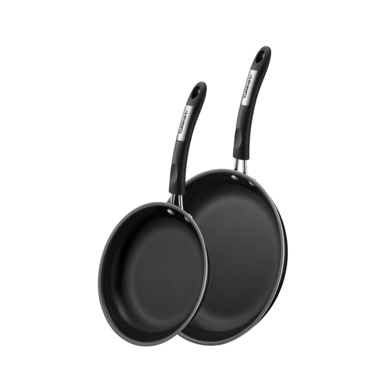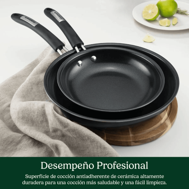 Este set de dos sartenes de la marca Cuisinart reúne una sartén de 22 cm y otra de 28 cm, ambas con recubrimiento cerámico antiadherente premium, diseñadas para ofrecer una cocción más saludable, facilitar la limpieza y brindar un acabado moderno en la cocina. Gracias a su núcleo de aluminio que calienta rápidamente y distribuye el calor de manera uniforme, podrás cocinar de forma eficiente y con excelentes resultados. Los mangos ergonómicos ofrecen un agarre cómodo y seguro, y el diseño permite usar menos aceite o manteca para evitar que los alimentos se peguen. Esta pareja es ideal para quienes buscan versatilidad en el tamaño —una para uso diario más ligero (22 cm) y otra para preparaciones más amplias (28 cm)— sin renunciar a un revestimiento de calidad.