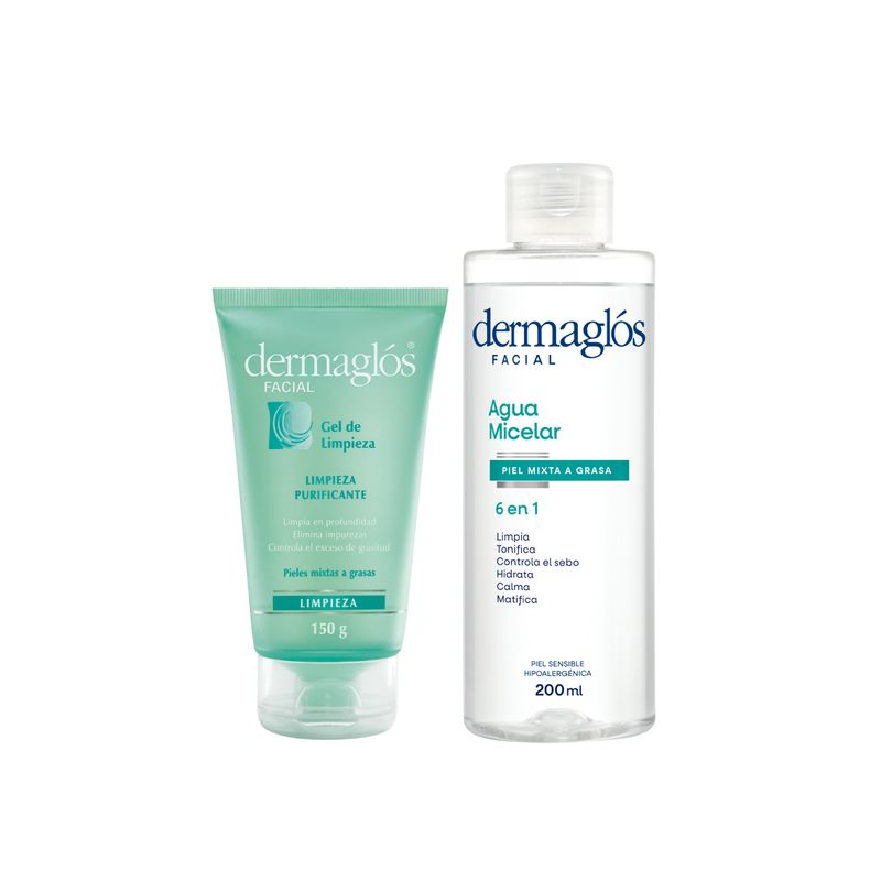 Piel purificada, equilibrada y libre de impurezas con la rutina Dermaglós diseñada para pieles mixtas a grasas. El Agua Micelar limpia, desmaquilla y tonifica en un solo paso, y el Gel de Limpieza Purificante, que elimina exceso de sebo sin resecar.