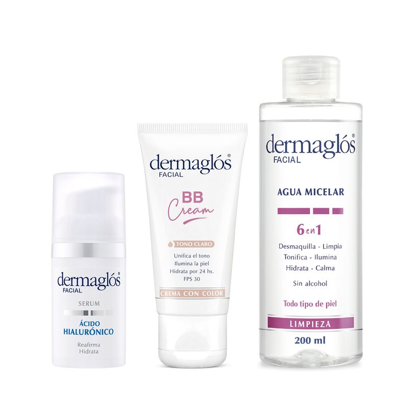 Agua Micelar Dermaglós 6 en 1 x200ml:El Agua Micelar Dermaglós resuelve la rutina de limpieza en un solo paso: desmaquilla, limpia, tonifica, ilumina, hidrata y calma. Con efecto purificante. Deja la piel suave y fresca sin sensación de oleosidad. Sin alcohol. Indicada para todo tipo de piel.