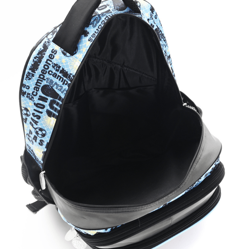 Incluye una mochila de 16 pulgadas, una lonchera térmica y una cartuchera doble cierre, todos combinados en el mismo diseño futbolero.