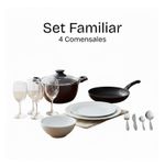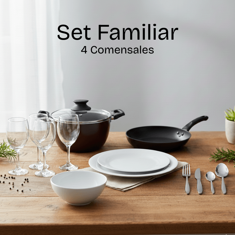Set Familiar para 4 Personas - Batería de Cocina, Vajilla, Copas y Cubiertos. Ideal primeros comienzos!