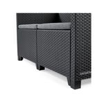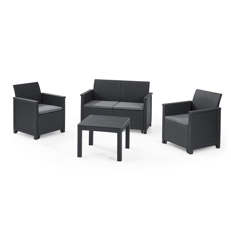 El juego de salón Keter Emma de cuatro plazas consta de 1 sofá de dos plazas, 2 sillones de asiento profundo, 4 cojines de asiento resistentes a la intemperie y una mesa de café de diseño elegante.