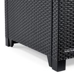 Todas las piezas tienen un diseño ergonómico de mimbre plano y se han fabricado con una resina duradera y resistente a la intemperie, con tratamiento UV para proteger contra las inclemencias.