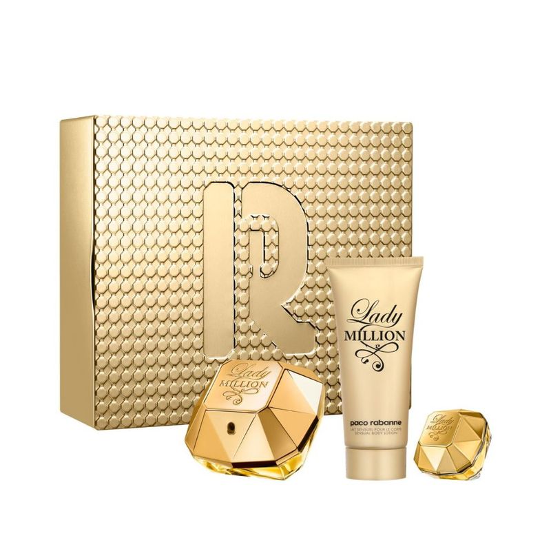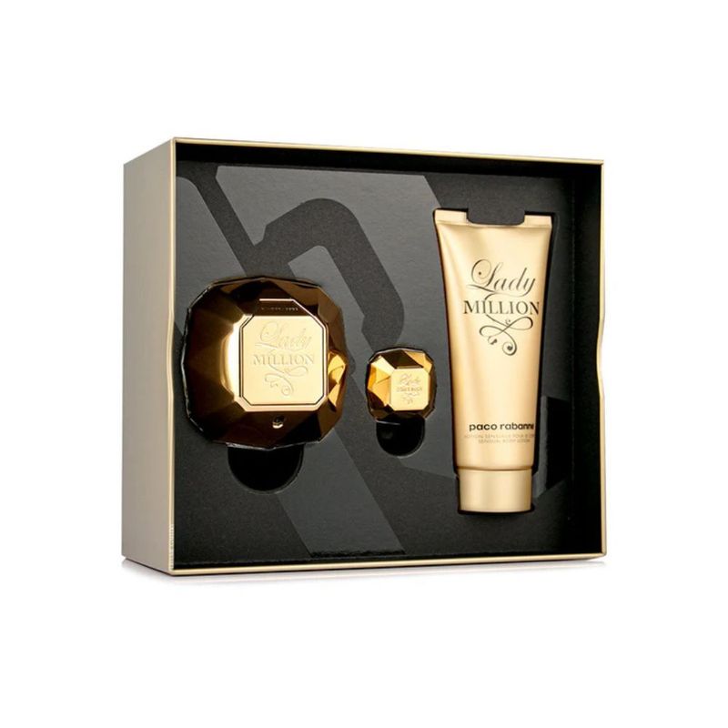 Set incluye tres productos: Lady Million EDP 80 Ml + + loción corporal 75 Ml + travel size 5 ml.