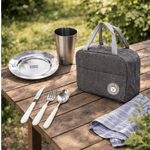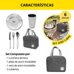 Este set completo incluye lunchera, vaso, plato, cuchillo, tenedor y cuchara, todos fabricados en acero inoxidable, garantizando durabilidad y fácil limpieza.