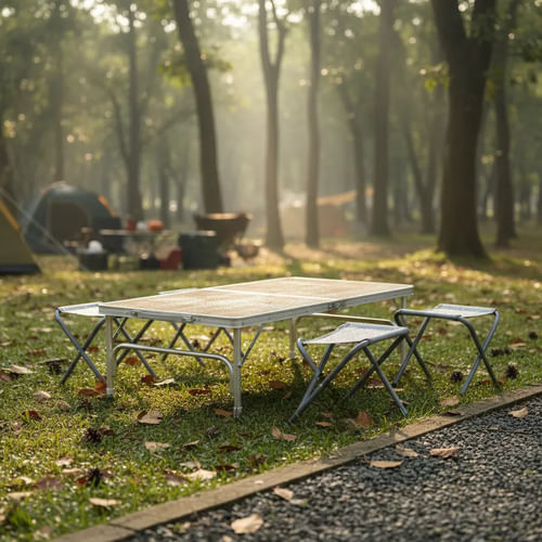 El combo perfecto para picnic o camping: mesa y sillas plegables fáciles de armar y transportar.