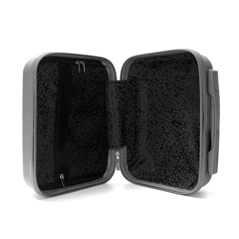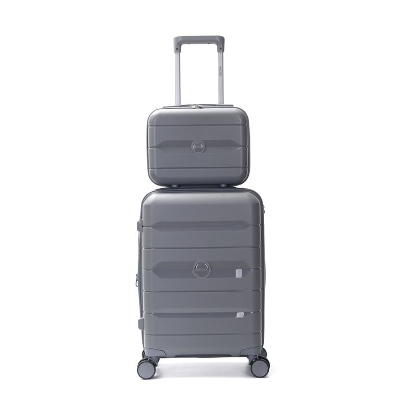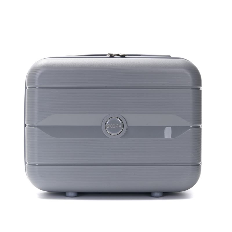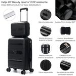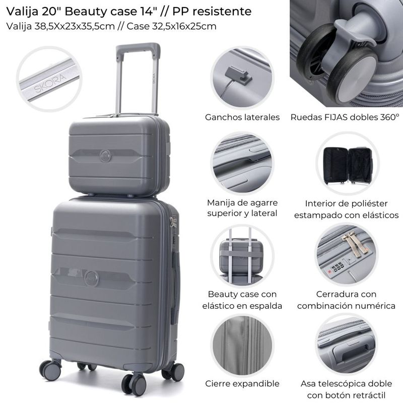 Set de valija y beauty case Skora fabricado en polipropileno resistente, ideal para viajes cómodos y organizados. La valija de 20 pulgadas cuenta con ruedas dobles fijas 360° para una movilidad fluida, cierre expansible para mayor capacidad y cerradura con combinación numérica para mayor seguridad. Su interior está forrado en poliéster estampado, con elásticos de sujeción y divisores con cierre. Incluye manijas de agarre superior y lateral, ganchos laterales y asa telescópica doble con botón retráctil. El beauty case de 14 pulgadas se acopla fácilmente a la valija mediante una banda elástica en la parte trasera.