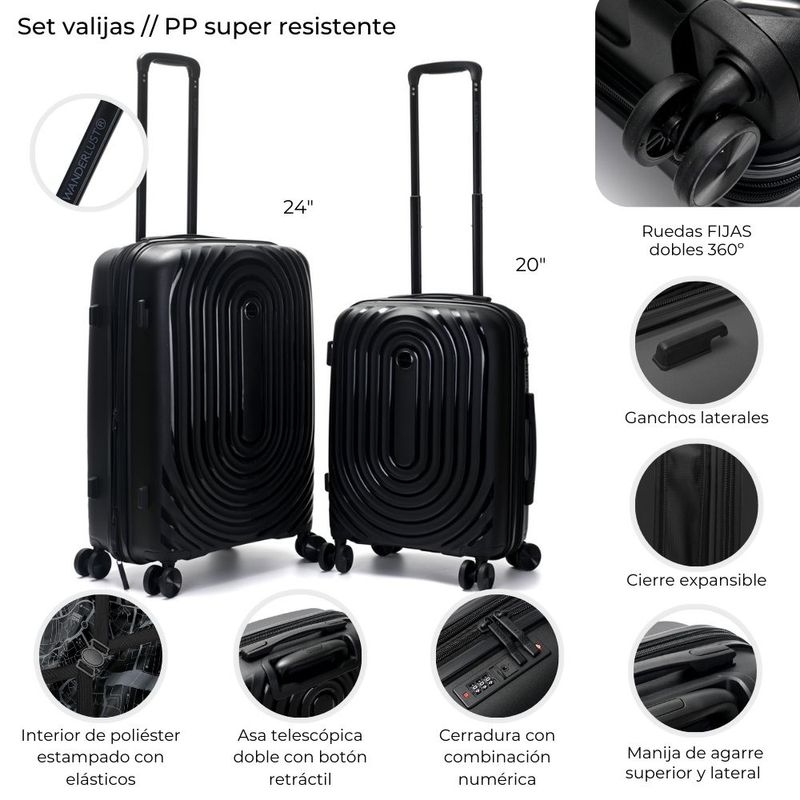 Viajá con estilo y seguridad con el Set de Valijas Wanderlust Urban Hard PP. Fabricadas en polipropileno súper resistente, estas valijas combinan durabilidad, diseño moderno y practicidad. Incluyen ruedas dobles fijas 360°, asa telescópica retráctil, manija de agarre superior y lateral, cierre expansible y cerradura con combinación numérica para mayor seguridad. Su interior de poliéster estampado con elásticos mantiene tu equipaje organizado. / Valija 24”: 63 x 43 x 26 cm / Valija 20”: 53 x 36 x 23 cm / Características destacadas: ruedas 360°, ganchos laterales, cierre seguro y diseño ultrarresistente. ¡Perfectas para cualquier aventura! ✈️