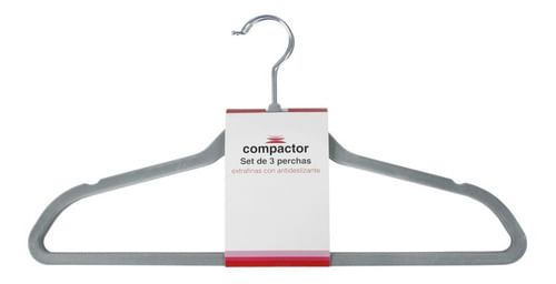 SET X 100 PERCHAS Colores disponible : NEGRO / GRIS / NATURAL Perchas ultrafinas, ultralivianas, anti deslizantes y super resistente. OPTIMIZAN EL ESPACIO EN TU PLACARD. No marcan la ropa. Sirve para todo tipo de ropa. Ancho : 44.5 cm Altura: 22.5 cm Gancho de metal reforzado. Cuerpo de la percha revestida en terciopelo. Marca : COMPACTOR