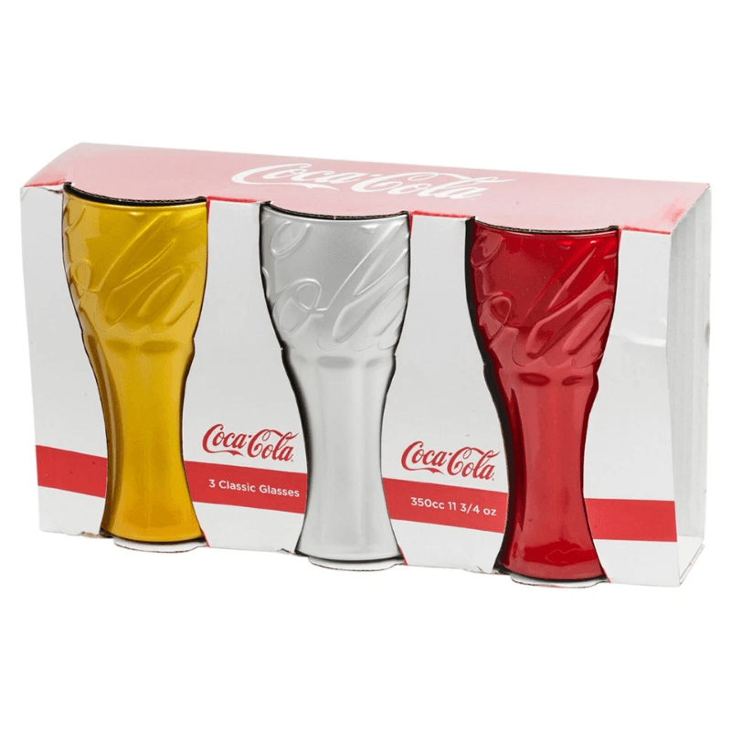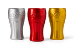 Set compuesto x 3 vasos de Coca Cola de color metalizado : rojo , dorado y plateado.