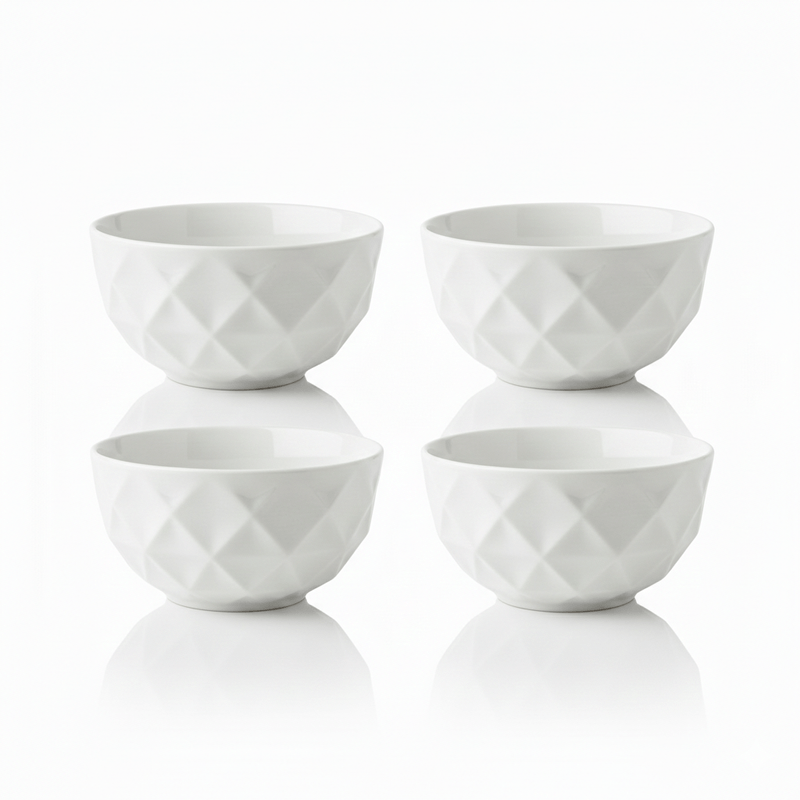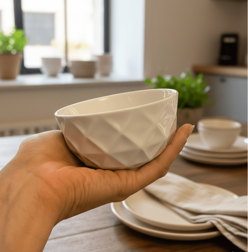 Dale un toque moderno y sofisticado a tus presentaciones con nuestro Set de 4 Bowls Facetados. Fabricados en cerámica de alta resistencia, éstos cuencos no solo son estéticos, sino que están diseñados para durar y estilizar cualquier ambiente.