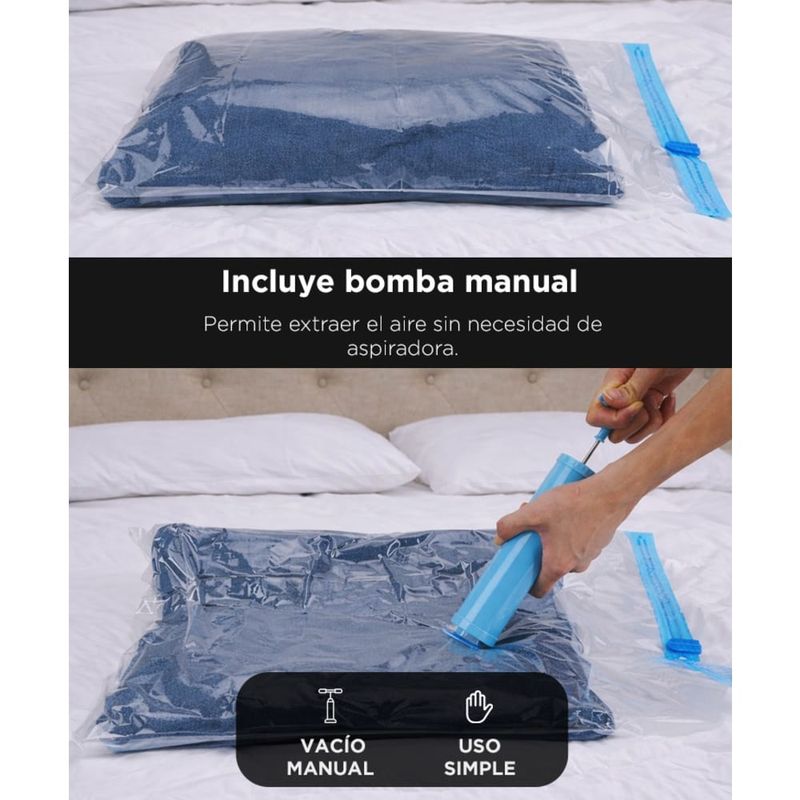 No necesitás aspiradora. La bomba incluida extrae el aire fácilmente y permite usar las bolsas en cualquier lugar.