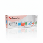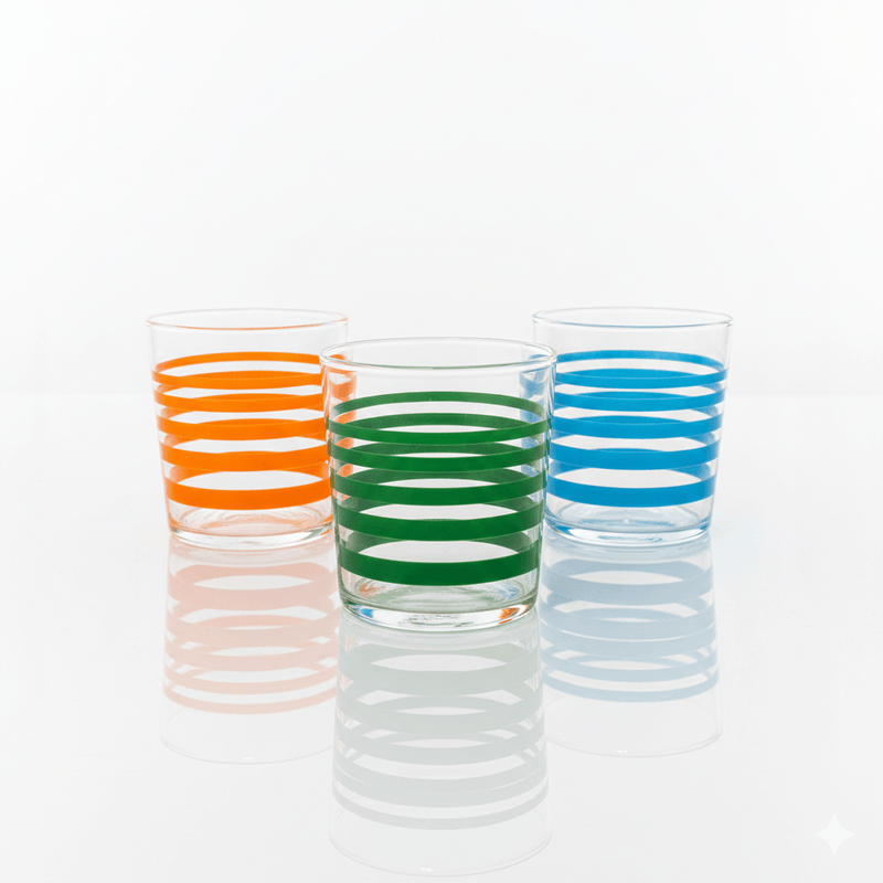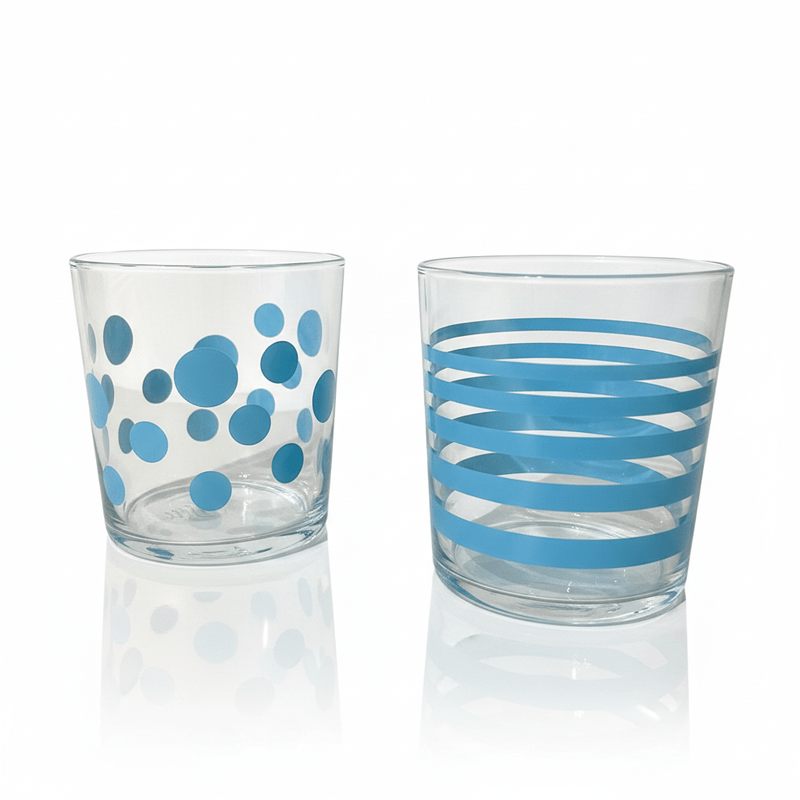 - Variedad Única: 6 vasos con combinaciones de colores (Naranja, Celeste, Verde) y diseños (Rayas y Lunares).