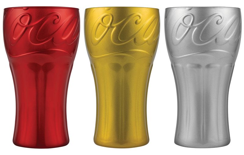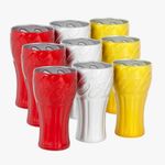 Set compuesto x 9 vasos de Coca Cola de color metalizado : rojo , dorado y plateado.