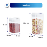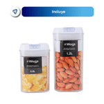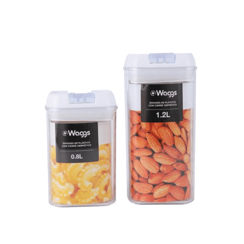 El set de frascos herméticos WAGGS FRAK01 incluye 2 contenedores de 0.8 L y 1.2 L, ideales para conservar alimentos secos con frescura y orden. Su cuerpo transparente permite identificar el contenido de un vistazo, mientras el cierre a presión con traba asegura un sellado perfecto que mantiene sabor y textura por más tiempo. Fabricados en materiales resistentes y libres de BPA, son aptos para heladera y despensa, fáciles de limpiar y diseñados para optimizar el espacio en tu cocina. Una solución práctica y elegante para organizar tu alacena con estilo.