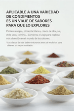 Pimienta negra y blanca, Sal, Clavos de olor, Chile seco, Comino y más