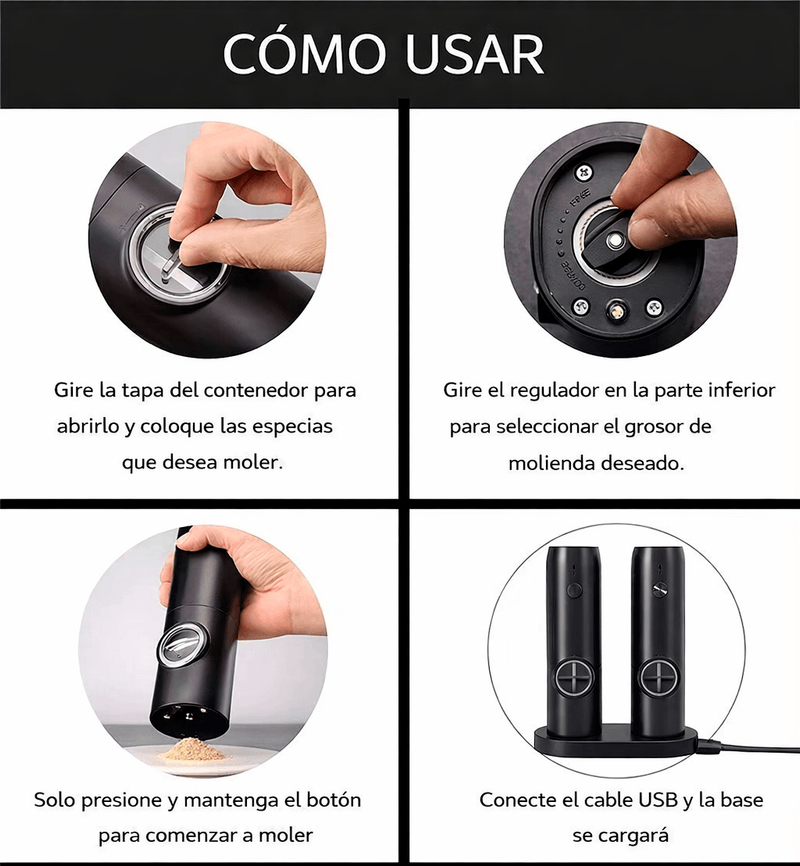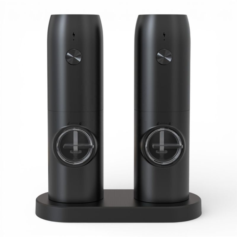 Disfruta de una experiencia de condimentado moderna, práctica y precisa con este set de molinillos eléctricos de sal y pimienta, diseñado para aportar comodidad y estilo a tu cocina.
