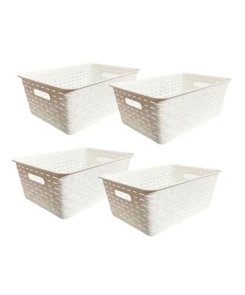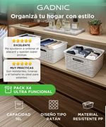 La Cesta Organizadora Gadnic Mediana Ratán se entrega en pack de 4 unidades, permitiendo ordenar distintos ambientes del hogar de forma uniforme. Ideal para placares, baños, dormitorios o estanterías abiertas.