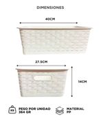 Cada unidad ofrece 16L de almacenamiento, con dimensiones de 40 x 27.5 x 14 cm que permiten guardar ropa doblada, juguetes, toallas o accesorios sin ocupar espacio excesivo.