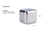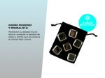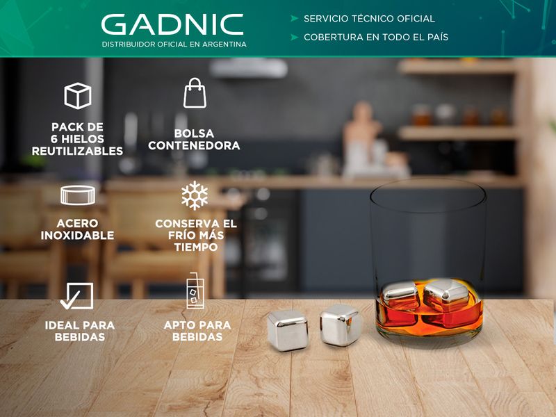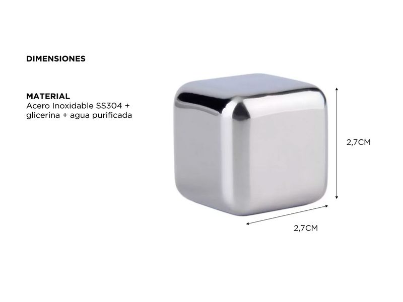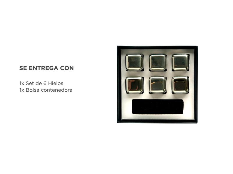 Cada set incluye 6 cubos de hielo reutilizables, fabricados en acero inoxidable de alta calidad que asegura la durabilidad y resistencia del producto. Gracias a su material, estos cubos mantienen su bebida fría sin diluirla, evitando la pérdida de sabor y aroma que se produce al utilizar hielo común.