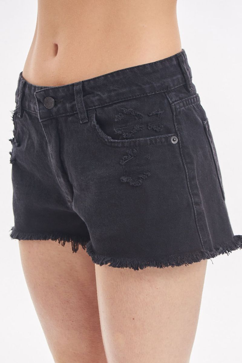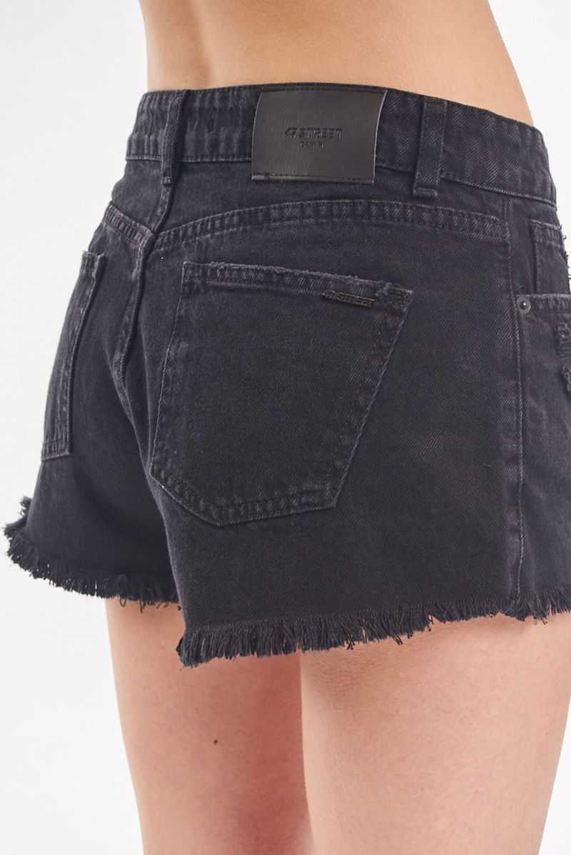 Short 5 bolsillos de gabardina color negro, tiro medio. Con roturas delanteras en bolsillos. Terminación de ruedo desflecado.