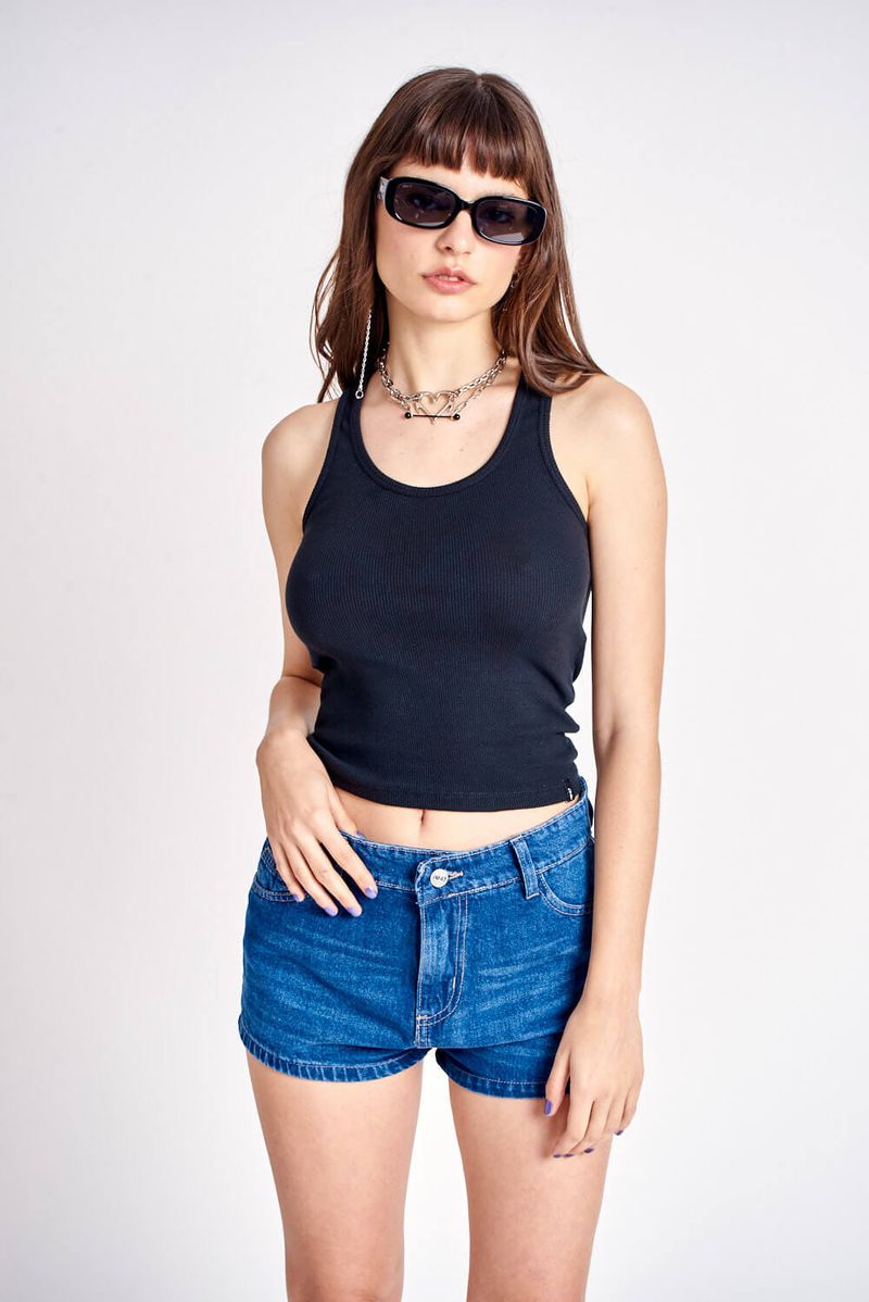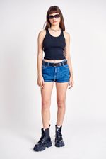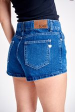 Short de jean 5 bolsillos, tiro bajo, en lona 100% algodón lavado azul oscuro.