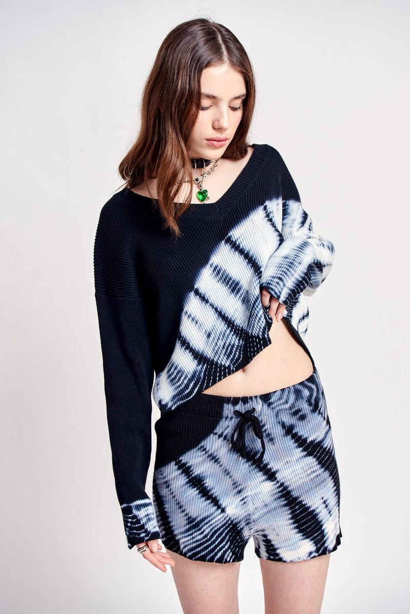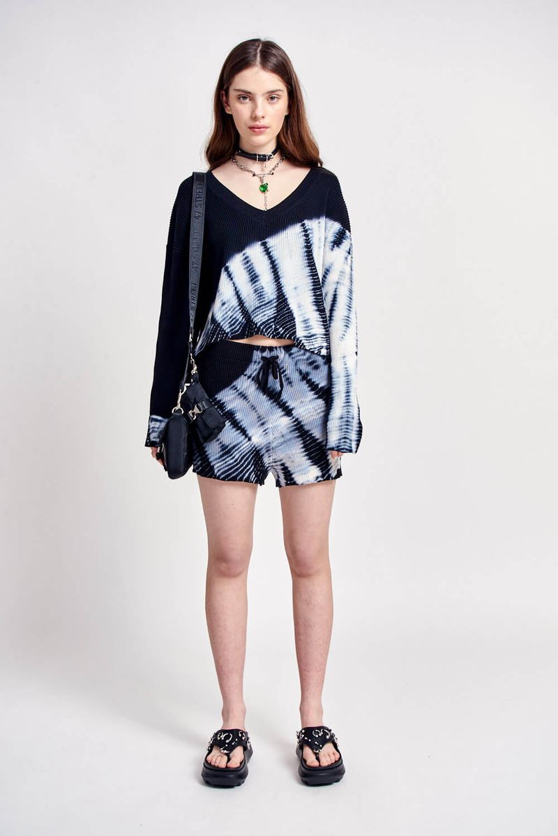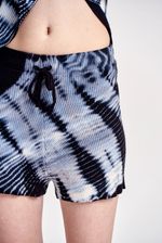 Short tejido 100% algodón, con batik teñido en prenda. Cintura con elástico interno y cordón en la misma calidad.