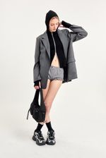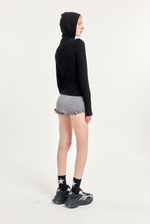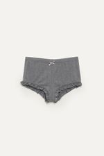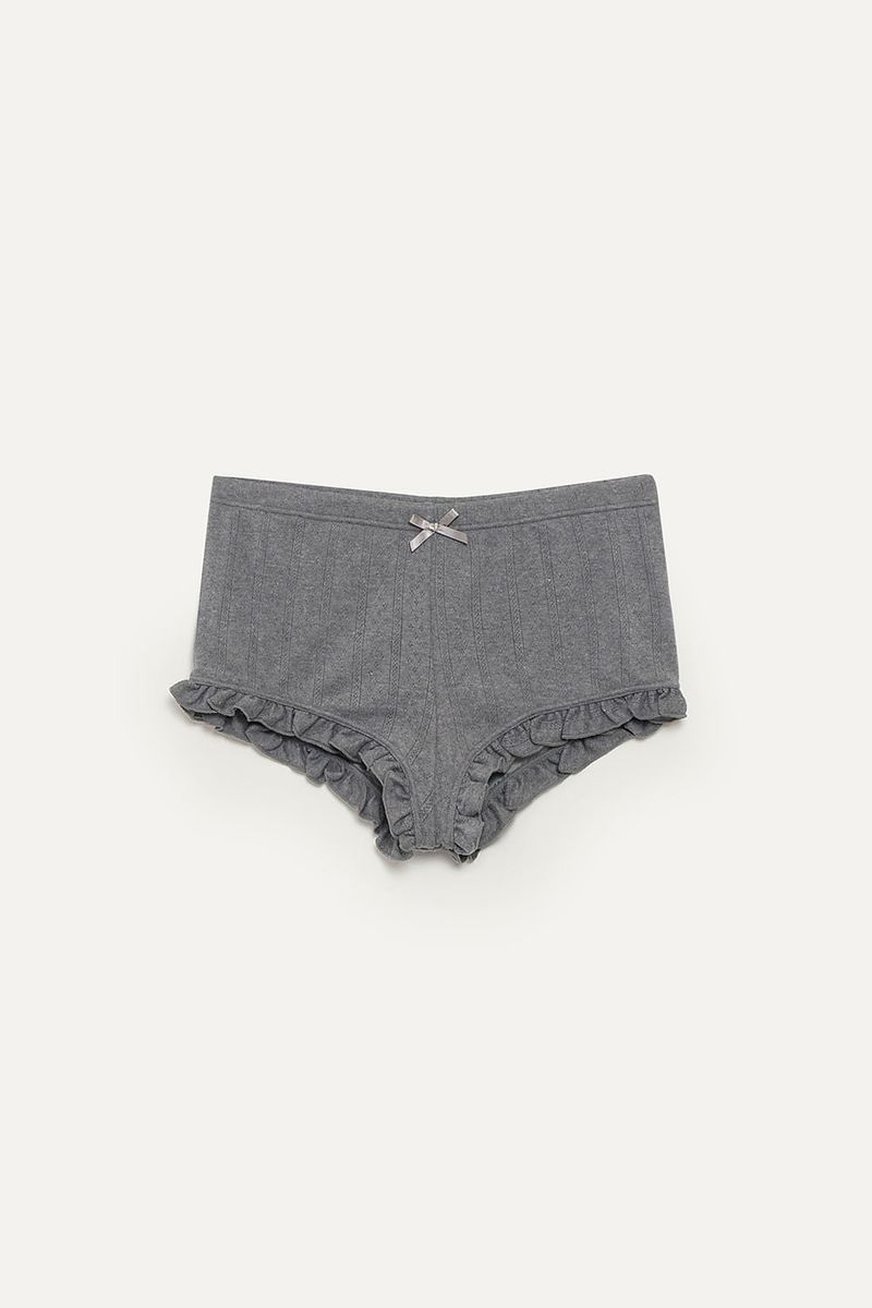 Short corto con motivo calado y volados, cintura con elástico interno oculto y moño de raso en el centro. Con detalles delicados, es perfecto para looks con remeras amplias o musculosas al cuerpo.