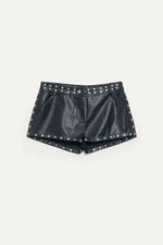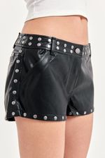 Short efecto piel con tachas metálicas en delantero y espalda. Posee presillas en cintura y cierre central con bragueta metálica. Bolsillos traseros con ribete y forrería interna al tono. Un básico con onda que podes usar con tops ajustados y botas negras para un look fuerte.