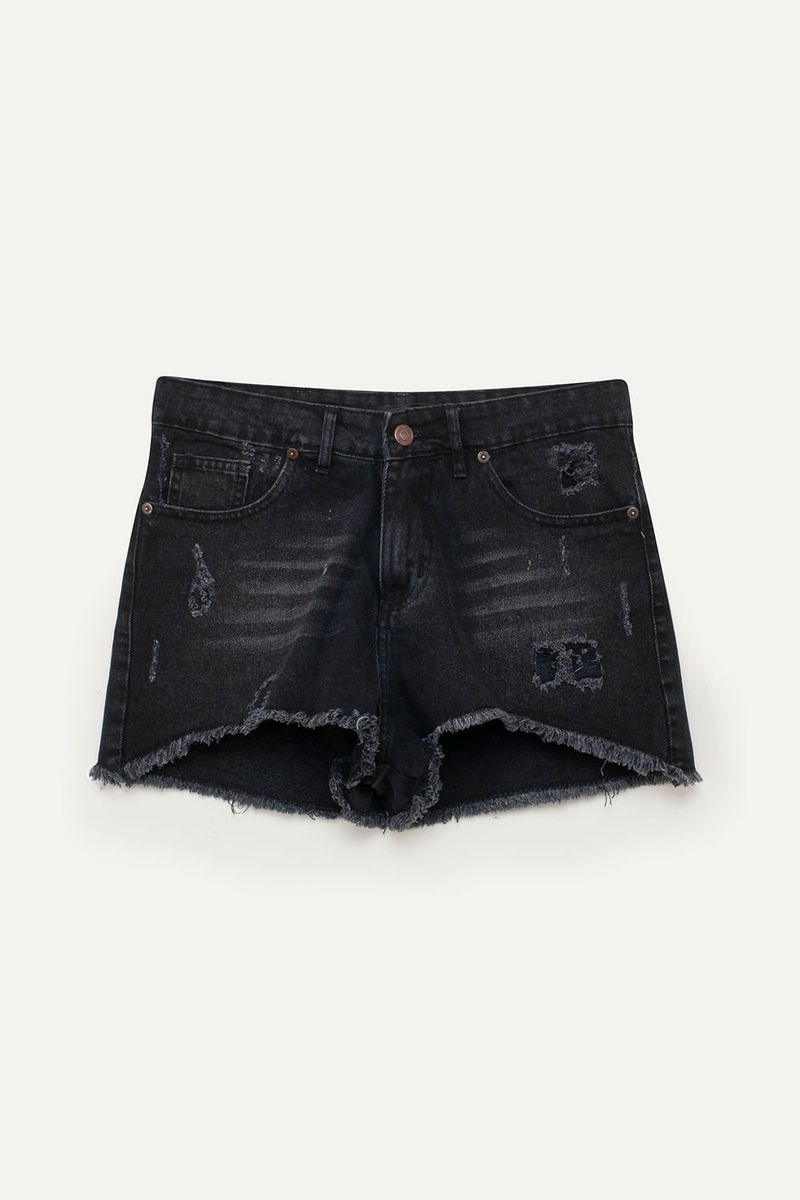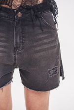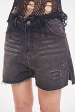 Short relajado tipo bermuda corta, tiro bajo, con roturas en el frente y pequeños tajos en laterales. Ruedo al corte. Lavado gastado tirando a gris.