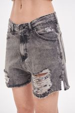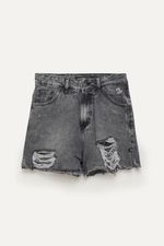 Short relajado tipo bermuda corta, tiro bajo, con roturas en el frente y pequeños tajos en laterales. Ruedo al corte. Lavado gastado tirando a gris.