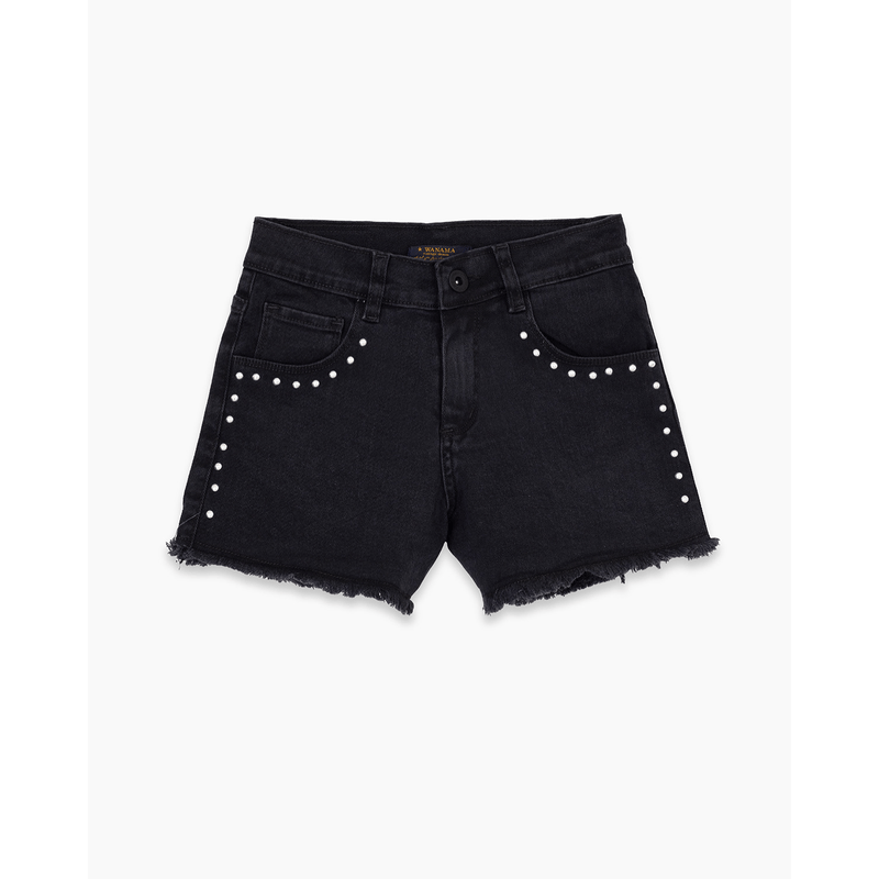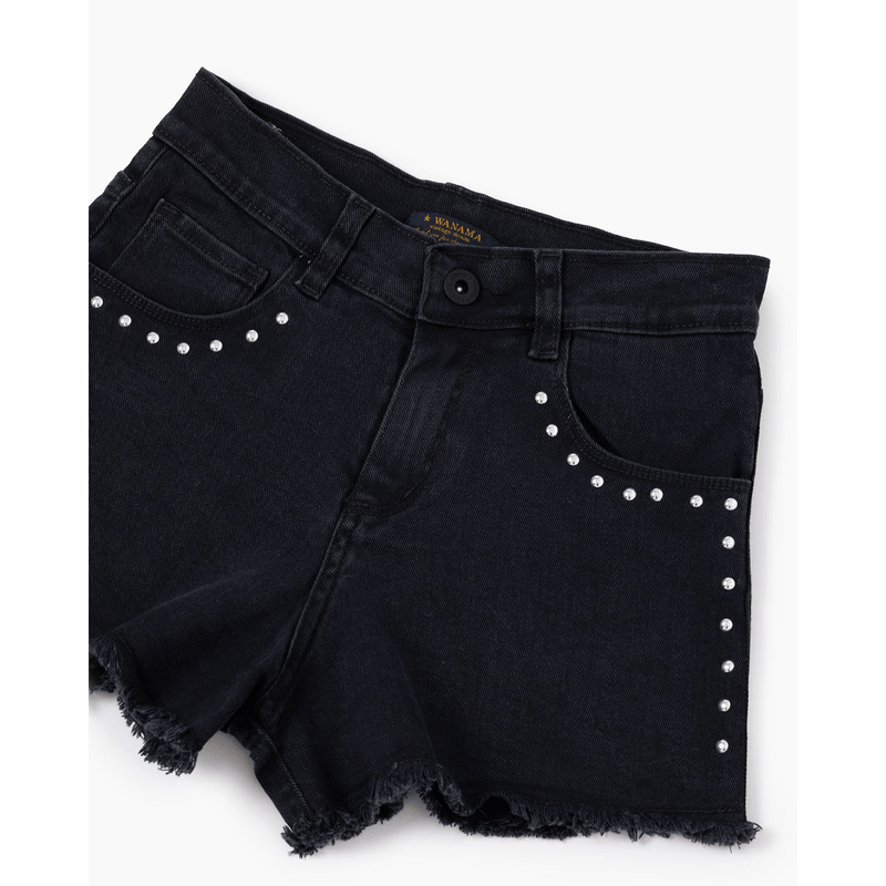 Short cinco bolsillos confeccionado en gabardina confort. Posee presillas en cintura y acceso a la prenda mediante cierre y botón metálico. Cintura con elástico con ojal interno hasta talle 8 inclusive, que se ajusta mediante botones. Calce relajado. Lleva tachas aplicadas. Es un ítem ideal para armar tus looks este verano.