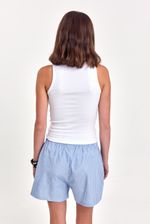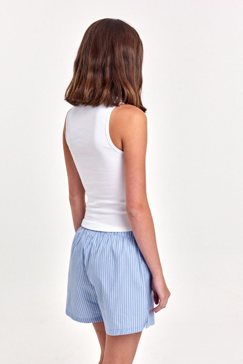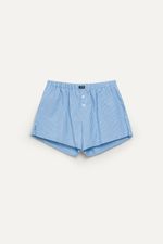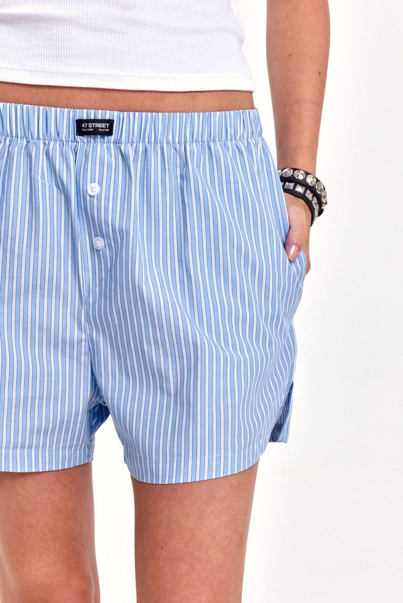 Short tipo bóxer confeccionado en poplín rayado, con cintura elastizada que aporta comodidad y botones decorativos en la cartera simulada. Incluye bolsillos laterales y pequeños tajos en el ruedo para un calce fresco y descontracturado. Detalle de la marca con logo en el frente. Ideal para looks relajados, combinable con remeras básicas o tops cortos.