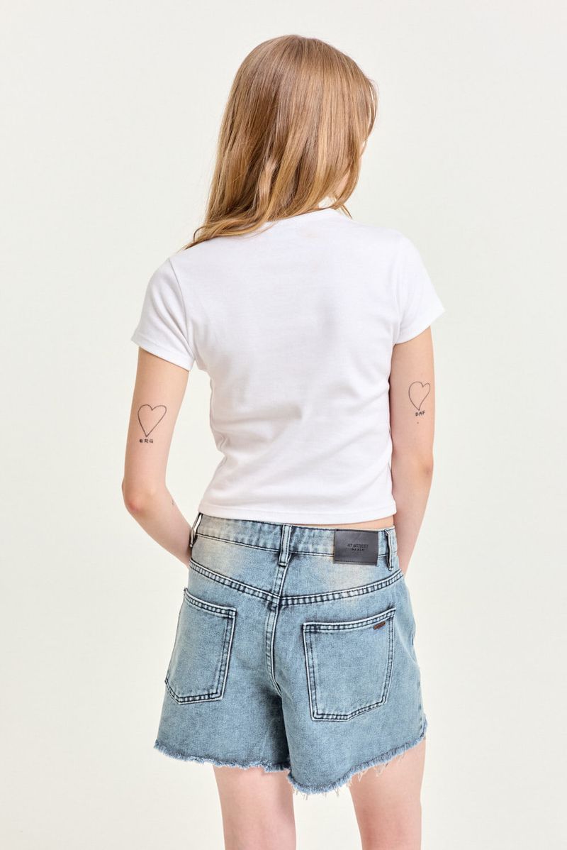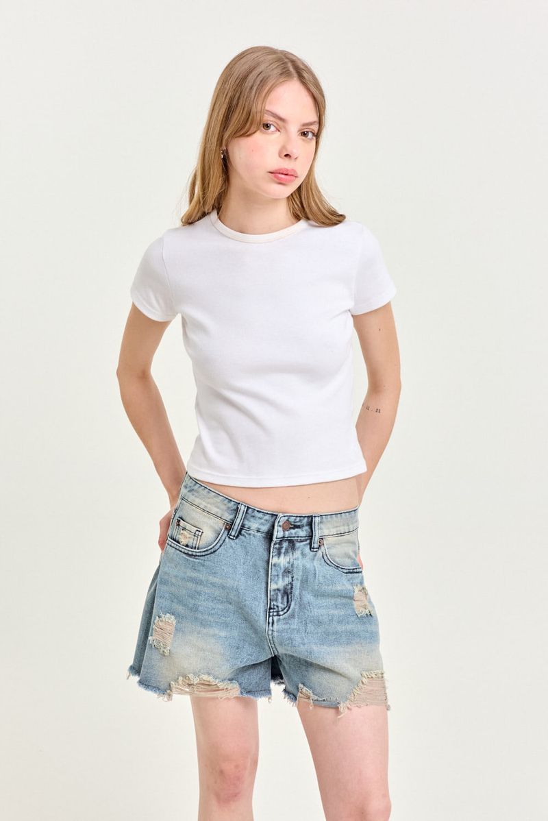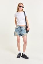 Short 5 bolsillos en denim rigido, calce relajado tipo bermuda, tiro medio- alto y ruedo al corte. Lavado matizado que puede variar de una prenda a otra levemente ya que es un proceso artesanal.