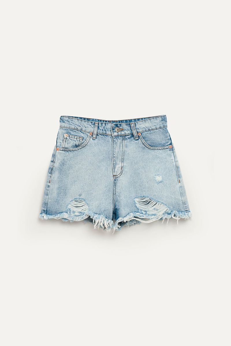 Short 5 bolsillos en denim rígido con calce relajado y tiro medio-alto. Presenta un lavado azul claro con roturas irregulares al frente y remaches color bronce en contraste con el botón niquelado. El lavado es artesanal, por lo que cada prenda es única. Ideal para llevar con tops ajustados o camisas para un look fresco.